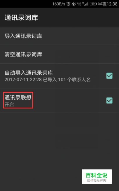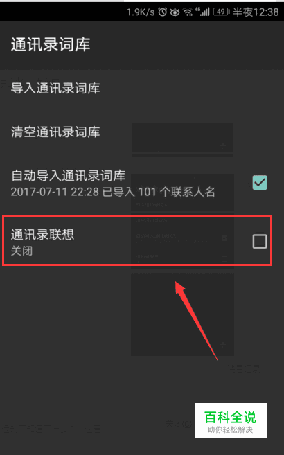 来到通讯录词库,我们可以看到通讯录联想是关闭的,如图。