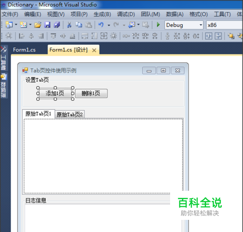 在新程序界面空白窗口上放置合适的控件:包括, 显示操作流程的textbox控件; 测试用的tabcontrol控件,含2个原始页; 用于设置tab页的【添加1页】和【删除1页】按钮。