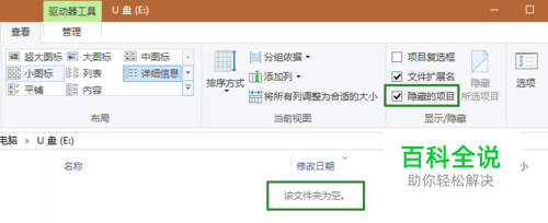 这种问题如图。打开U盘无任何内容,却显示有已用空间。 首先在查看面板下,勾选隐藏的项目,确认无普通隐藏项目。