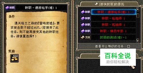 注:转职任务最多也只能在4个任务中选择一个.当玩家接受了一个职业的专职任务后,若未完成可以放弃后重新接受转职任务,若完成了某个转职的任务,则无法再完成其他职业的转职任务.请谨慎选择.