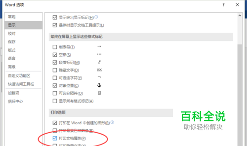 6、在“显示”选项卡栏的右侧窗格中,找到“打印选项”区域下的“打印文档属性”选项,并将其复选框勾选即可。如图所示;