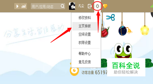 进入个人中心之后,在空间的右上角,有一个齿轮状的设置图标,打开可以看到主页排版这个栏目,点击进去。