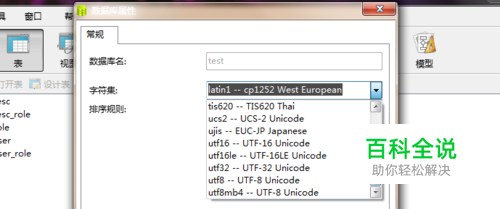 第三步,打开数据库属性对话框,找到字符集,右边有一个选择字符集的下拉框,点击,选择utf-8,如图: