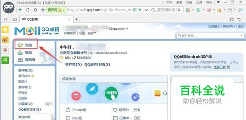 在你的电脑上登录qq的邮箱,进入邮箱首页以后,左上角的位置有个“写信”项,点击它,如图所示。