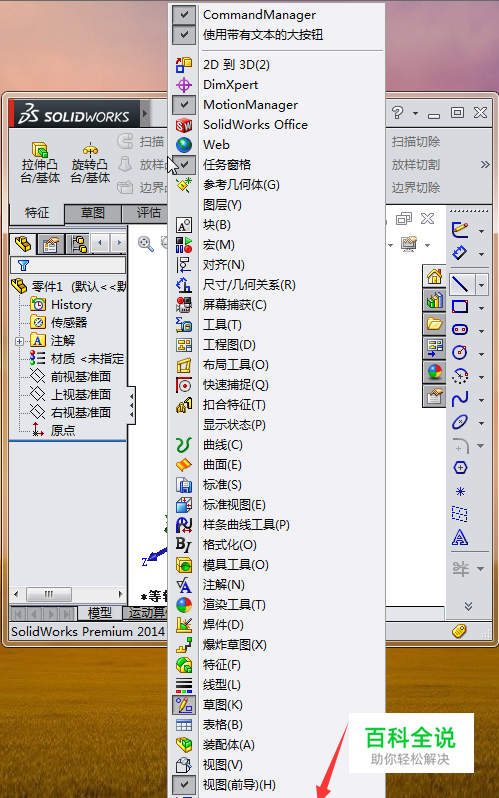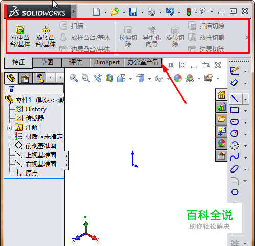 首先,打开solidworks软件,在页面上方点击右键,如图所示