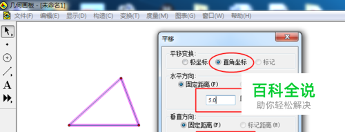 使用平移变换画图。选中三角形,单击变换菜单,选择平移,输入平移距离后单击平移。这里选择直角坐标,极坐标操作也一样。