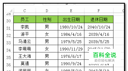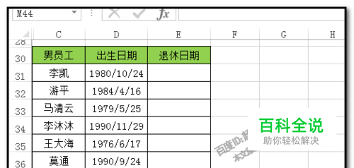 图中有这么一个表格数据,现在,要计算出该公司男员工的退休日期。 比如,男性的法定退休年龄是60岁。
