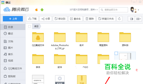 文件上传成功后,可以随时随地找到你的文件或图片了(还可以实现文件共享),在另外的电脑,登录你的QQ(也可从别的入口登录你的微云端口),进入微云,选择在图片的左上角 —”打勾“,选择“下载”,如下图所示。