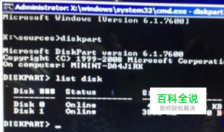 在打开的命令提示符在输入“Diskpart”命令并按回车,接着输入“list disk”命令按回车查看磁盘信息,注意看磁盘容量来选择,下图中465G的Disk 0是硬盘,3852M的Disk 1是用于Win7安装的U盘;