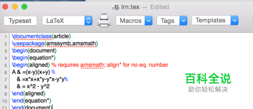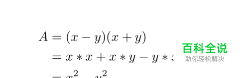 所以完整latex代码如下所示: \documentclass{article} \usepackage{amssymb,amsmath} \begin{document} \begin{equation*} \begin{aligned} % requires amsmath; align* for no eq. number A & =(x-y)(x+y) \\ & =x*x+x*y-y*x-y*y\\ & = x^2 - y^2 \end{aligned} \end{equation*} \end{document}