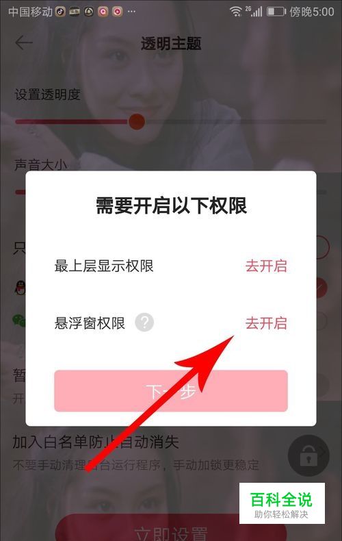 【第五个权限设置】 打开“需要开启以下权限”弹窗后,首先点击“最上层显示权限”右侧的“去开启”