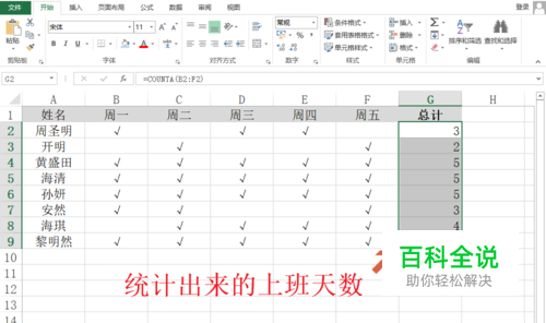 完成统计上班天数。 现在我们在Excel工作表中可以看到,G列存放的即是统计出来的上半天数。