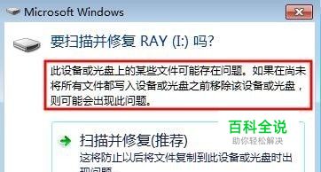 将U盘插入电脑,弹出来一个窗口, 选择扫描并修复。 为了演示,我是用了手动检查并修复的方法。