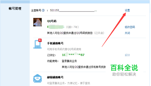 点击之后会自动跳转到“我的QQ中心”网页,点击导航栏的“账号”。你会看到QQ号码和其他辅助账号的信息,接下来就点击箭头所指的地方,设置主显账号。