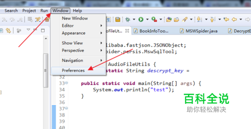 启动Eclipse后,在顶部的菜单栏找到Window点击打开,在弹出的菜单中选中preferences一项,点击进入下一步。