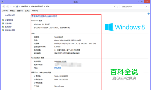 打开系统对话框,在这里人们可以看到这台电脑上的一些基本信息。系统:WIN8.1专业版64位,CPU:INTEL i3-3240、内存:8G,但这里看不到是什么牌子的内存。