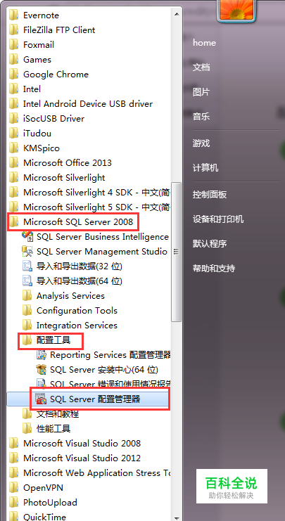 点击【开始】--【所有文件】--【Microsoft SQL Server 2008】--【配置工具】--【SQL Server 配置管理器】,如图所示