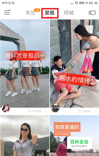 打开手机中的快手,在发现的界面中任意打开一个段视频查看时间。