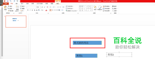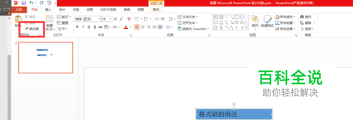 在PPT中,我们很经常会用到格式刷这个命令,格式刷是一种可以快速复制或者是黏贴段落式的以及字符格式的一种命名,在PPT中,我们可以想把一种格式快速的与另外一个格式相符,这个时候,我们就需要用到格式刷命令。