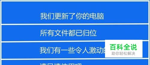改用Micrososft帐户登录后,重新启动电脑,电脑重启以后,会在显示器上连续出现4个屏幕,分别为: 我们更新了你的电脑 所有文件都已归位 我们有一些令人激动的新功能 请尽情使用吧