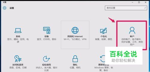 在打开的设置窗口,我们点击【帐户】(你的帐户、电子邮件、同步设置、工作、其他设置);