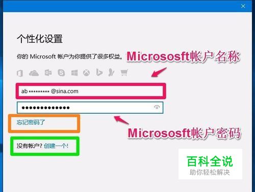 此时会打开个性化设置窗口,我们在第一栏输入已经建立的Micrososft帐户名称。在第二栏输入已经设置的Micrososft帐户密码,再点击:登录;(如果忘记了密码,点击: 忘记密码了;如果没有建立Micrososft帐户,点击: 没有帐户?新建一个。)