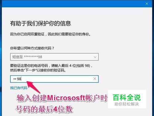 点击登录后,打开 有助于我们保护你的信息窗口,在第二栏输入建立Micrososft帐户时绑定手机号码的最后4位数,再点击:下一步;
