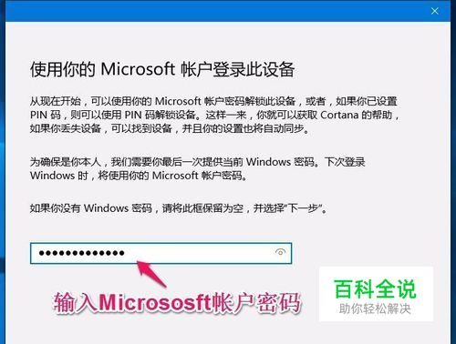 我们点击下一步以后,又打开一个 使用你的 Micrososft 帐户登录此设备窗口,在这个窗口的栏中输入Micrososft帐户密码,再点击:下一步;