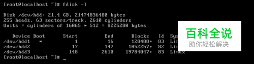 根据以上提示开始对新的硬盘进行分区操作,由于截图比较麻烦所以呢我把命里copy出来了,需要操作的部分我会标记出来 [root@Linux ~]# fdisk /dev/sdb //根据提示,对新硬盘进行分区操作Device contains neither a valid DOS partition table, nor Sun, SGI or OSF disklabelBuilding a new DOS disklabel. Changes will remain in memory only,until you decide to write them. After that, of course, the previouscontent won't be recoverable.The number of cylinders for this disk is set to 2610.There is nothing wrong with that, but this is larger than 1024,and could in certain setups cause problems with:1) software that runs at boot time (e.g., old versions of LILO)2) booting and partitioning software from other OSs (e.g., DOS FDISK, OS/2 FDISK)Warning: invalid flag 0x0000 of partition table 4 will be corrected by w(rite) Command (m for help): h //帮助信息h: unknown commandCommand action a toggle a bootable flag b edit bsd disklabel c toggle the dos compatibility flag d delete a partition //删除分区 l list known partition types m print this menu //查看操作指令的帮助信息 n add a new partition //新建分区 o create a new empty DOS partition table p print the partition table //列表查看分区信息 q quit without saving changes //放弃分区设置并退出 s create a new empty Sun disklabel t change a partition's system id //变更分区类型 u change display/entry units v verify the partition table w write table to disk and exit //保存分区设置并退出 x extra functionality (experts only) Command (m for help): n //输入 n,新建分区Command action e extended //新建逻辑分区 p primary partition (1-4) //新建主分区p //输入 p,建立主分区Partition number (1-4): 1 //一共可以分4个主分区,输入 1,建立第一个主分区First cylinder (1-2610, default 1): //选择该分区的起始磁盘数,如无特殊需求强烈建议选择默认,也就是默认用1 来分区(直接按回车)Using default value 1Last cylinder or +size or +sizeM or +sizeK (1-2610, default 2610): //定义该分区的大小,如果按默认(直接回车),就是使用全部可用存储空间;如果要分成一个 1G 的空间,输入 +1024m 即可,1G=1024m算法以此类推Using default value 2610Command (m for help): w //写入分区信息,其实就是保存分区信息The partition table has been altered!Calling ioctl() to re-read partition table.Syncing disks.