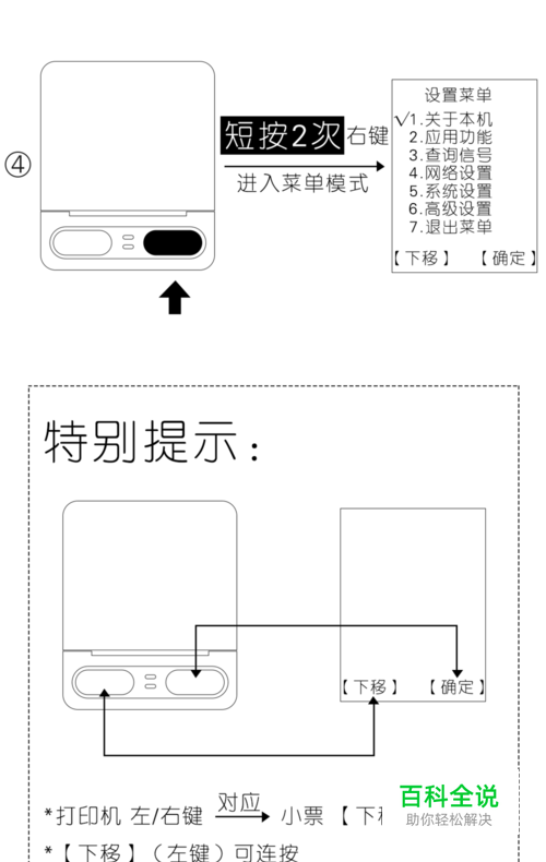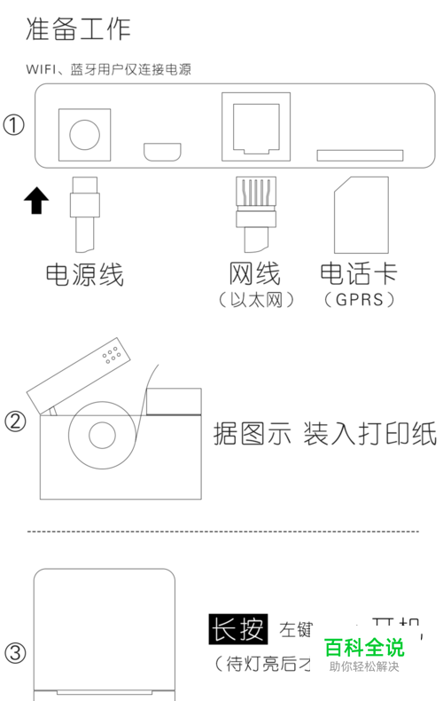 连接电源,装入打印纸; 长按左键—开机;