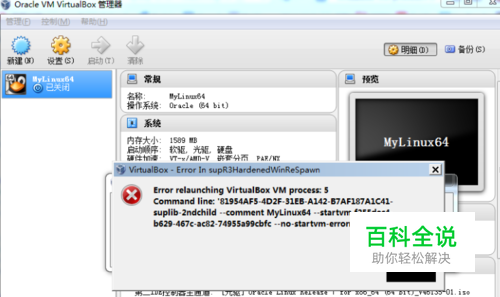 出现报错:Error relaunching VirtualBox VM process: 5 如下图