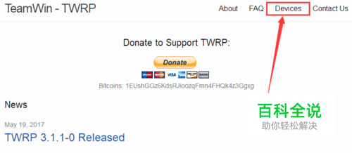 官网下载TWRP 打开官网,点击右上角的Devices 下面大字体的3.1.1和3.1.0是文档相关,没有提供下载链接的