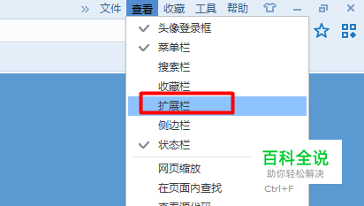 安装搜狗高速浏览器,点击“工具”菜单项中的“扩展栏”项,来打开“扩展栏”面板。