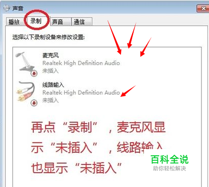 首先检查系统声音设置是否正常。 在桌面右下角:右键声音图标—声音 打开后,图中显示为:未插入 如图所示: