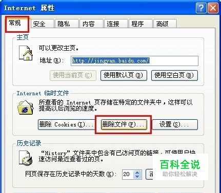 在打开的“Internet选项”窗口中,点击“Internet 临时文件”→“删除文件”按钮,来消除Internet临时缓存文件夹。