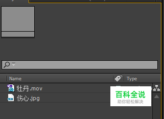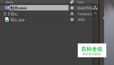 打开软件AE ,导入你的素材,这里以一个视频牡丹和图片伤心为例。将图片伤心拖到右边窗口,作为背景,以便后期的观察。