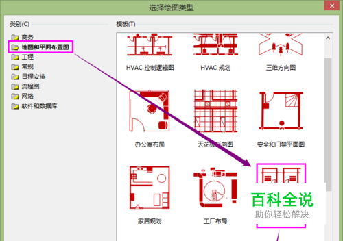 新建一个visio文件并命名,打开后会有个 类型选择向导,选择 地图与平面布置图中的 平面布置图。