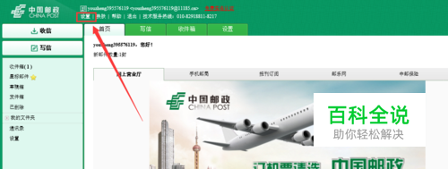 登陆自己中国邮政安全电子邮箱,并点击左上角的设置。