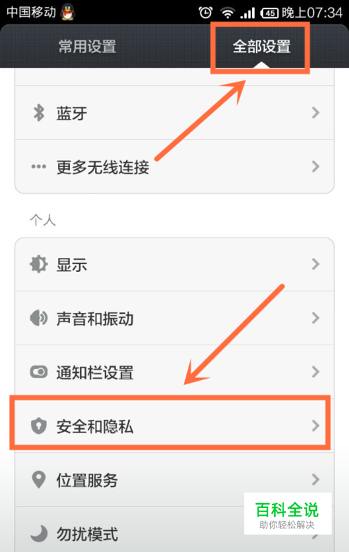 进入小米手机的 全部设置,找到 安全和隐私,如下图