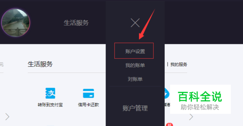 点击新版本的支付宝的界面,登陆之后,点击右侧的“账户管理”选项,在弹出的下拉菜单中选择“账户设置”选项。