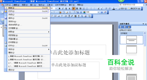打开已做好的或想继续做的PPT 1、选中“文件” 2、单机“打开” 3、打开文件