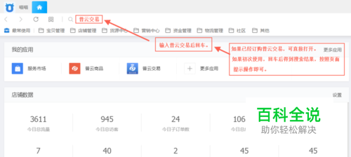 第二步:登陆千牛,搜索添加打印软件即普云交易。 使用您的淘宝账户登陆千牛,在上方输入普云交易进行搜索,然后把普云交易添加到页面的上方即可。以后可直接进入进行打印电子面单、快递单,和发货单。