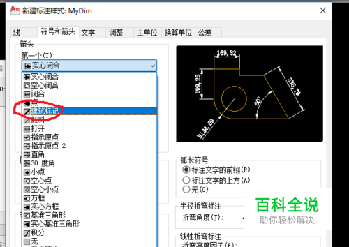 在建筑结构图中,通常会在一幅图中同时包含建筑标记(用于线)和实心箭头(用于标注半径等),如何在一种标注样式中实现呢?