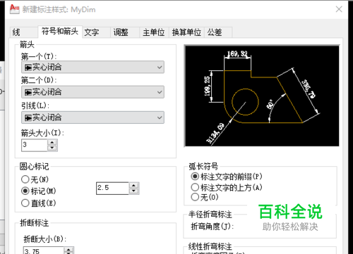 在“符号和箭头”选用“实心闭合”,其他通通不变,点确定; 标注样式就如图2所示了,这样同一副图用一组标注样式就能同时标注建筑标记和箭头了。 实际标注效果如最后一幅图。