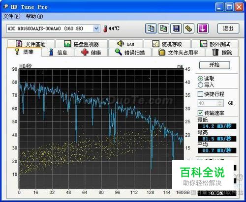 1:基准(磁盘性能)测试 启动软件后,将首先会显示出硬盘的型号及当前的温度,默认显示为磁盘基本测试界面,在此用户可以通过点击“开始”按钮,对硬盘的读写性能进行检测,主要包括读取及写入数据时的传输速率、存储时间及对CPU的占用等;并且,整个测试过程会持续几分钟,用户需要耐心等待。 注意:由于写入测试存在危险,希望用户慎重使用。 图2:HD Tune硬盘性能测试