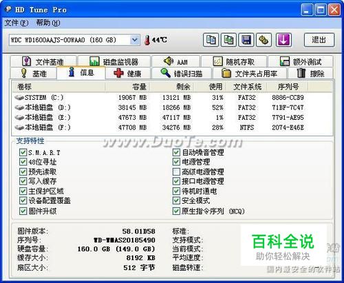2:磁盘详细信息 在信息标签页面,HD Tune不仅列出了当前硬盘各个分区的详细信息,还提供此硬盘所支持特性。另外,在此画面还提供了硬盘的固件版本、序列号、容量、缓存大小以及当前的Ultra DMA模式等,可以说是非常详细。 图3:HD Tune硬盘分区信息及固件资料