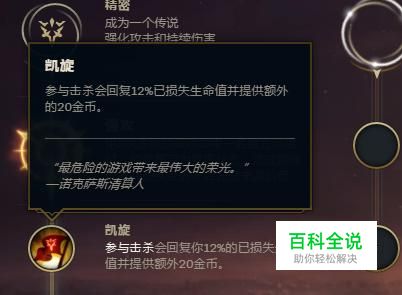 主系符文第二层选择凯旋,增加前期抓人越塔存活的可能性,后期团战也有很大的续命作用,不过根据个人喜好不同也可以选择气定神闲,让大招冷却更快,让剑圣可以更多的抓人。