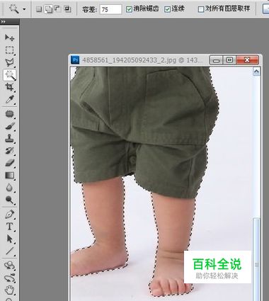 接下来我们进一步选择背景。先单击工具箱中的缩放工具,放大照片的部分地方。还是在魔棒工具选项栏中的“添加到选区”图标被选中的情况下并适当地改变其容差参数值,再使用魔棒工具单击未被选中的背景区域,这样就会进一步增加了背景区域的选择。