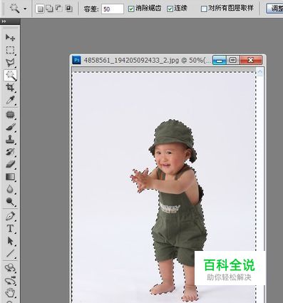 在Photoshop CS中文版中打开照片后,单击工具箱中的魔棒工具,然后在出现的工具选项栏中设置容差参数值为50。接着在人物背景上单击鼠标左键,这时就可以得到大部分的背景选区了。对于不连续的选区,我们可以在选中魔棒工具的情况下再在其工具选项栏中单击“添加到选区”图标或者按住键盘上的Shift键再单击其他想要选取的地方来选择。