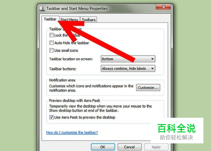 点击“属性”。一个叫“任务栏和开始菜单属性”的新对话框会弹出。点击顶部“任务栏”的标签。